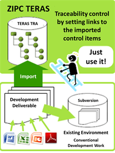 Document files such as Microsoft Word, Excel, PowerPoint and PDF can be imported as they are.Because ZIPC TERAS is used only when traceability is followed, development sites can ensure traceability without changing tools.Also, it supports both manual tracing by item and auto-tracing in case IDs and the tracing rules are established.
